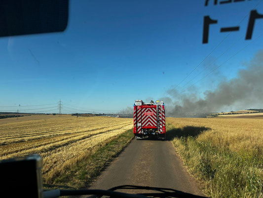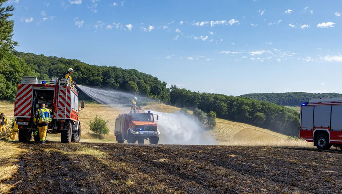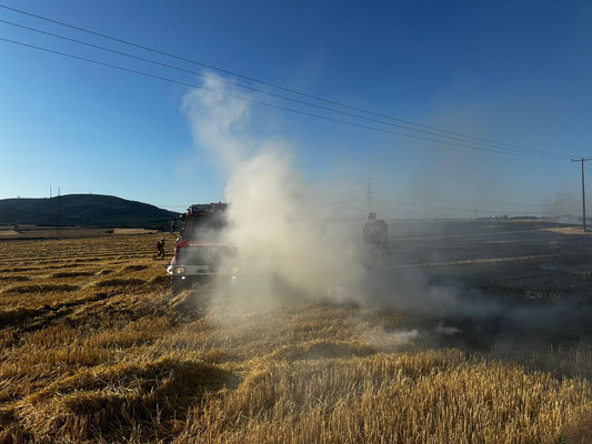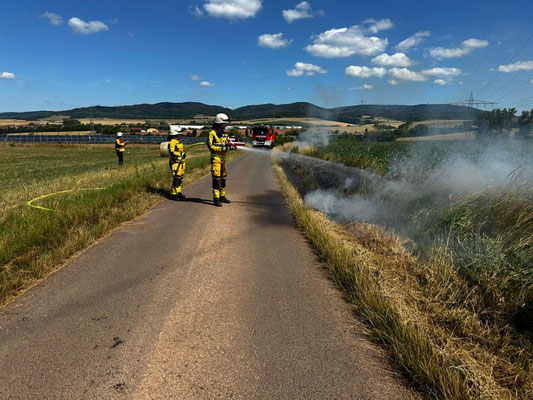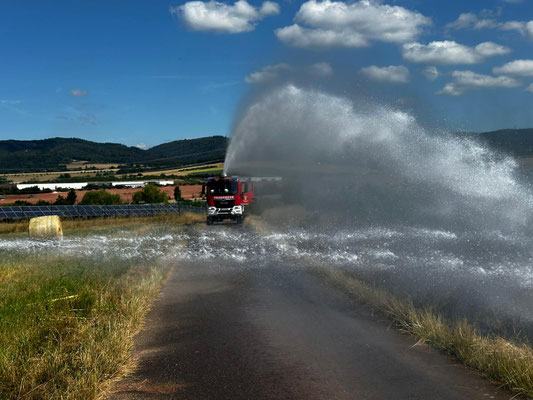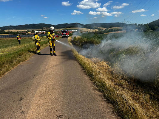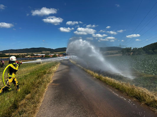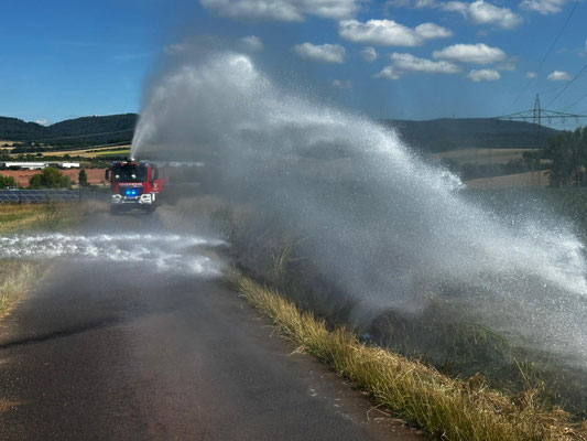 Vorort brannte der Grünstreifen zwischen Straße und Feld. Mittels Schnellangriff und Dachmonitor des TLF-Winnweiler wurde der Brand schnell gelöscht.