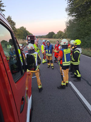 Vor Ort stellte sich schnell heraus, dass die beiden im PKW befindlichen Personen im Fahrzeug eingeklemmt waren, weshalb unverzüglich mit den Befreiungsmaßnahmen durch hydraulische Rettungsgeräte begonnen wurde. Ein Rettungshubschrauber war bei Eintreffen der Feuerwehr bereits vor Ort, weitere Rettungsmittel befanden sich auf der Anfahrt. Insgesamt waren schlussendlich drei Rettungswagen (RTW), ein Krankentransportwagen (KTW), ein Notarzteinsatzfahrzeug (NEF) sowie zwei Rettungshubschrauber (RTH) und das Medical Intervention Car (MIC) an der Einsatzstelle. Aufgrund der erhöhten Anzahl an beteiligten Personen und der damit einhergehenden Anzahl an Rettungsmitteln war die Einsatzabschnittsleitung Gesundheit ebenfalls vor Ort.