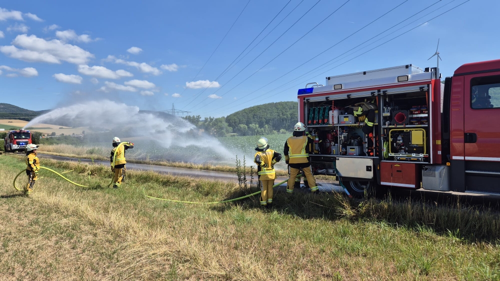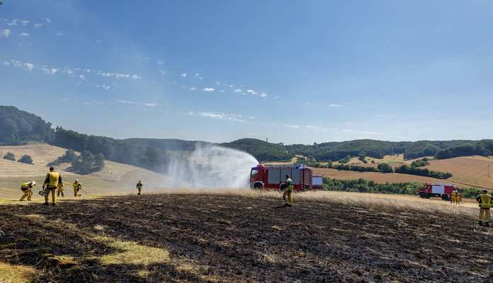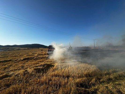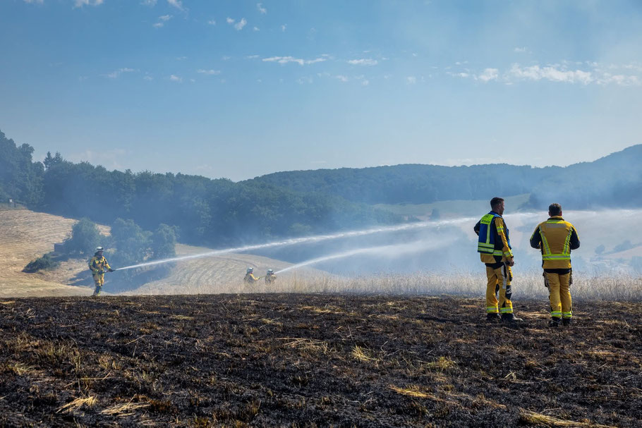 Am Donnerstag, den 03.07.2025, wurden gegen 16:30 Uhr die Feuerwehren aus Münchweiler, Gonbach, Imsbach, Steinbach und Winnweiler zu einem großen Flächenbrand am Ortsrand von Münchweiler alarmiert. Während der laufenden Heuernte geriet ein Feld in Brand, das sich aufgrund der trockenen Vegetation und Hanglage rasch in Richtung eines angrenzenden Wohngebiets ausbreitete.