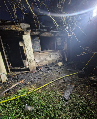 Mit fortschreitender Uhrzeit setzte auch die Dunkelheit ein, weshalb die Einsatzstelle umfangreich ausgeleuchtet wurde. Nachdem das Feuer unter Kontrolle gebracht war, begannen die Kräfte damit, die brennenden bzw. abgebrannten Bauteile des Gebäudes zu demontieren und das gesamte Objekt möglichst tiefenwirksam abzulöschen, was unter anderem durch den Einsatz von Schaum als Löschmittel gelang. Die Drohneneinheit unterstützte die Nachlöscharbeiten mit Bildern der Wärmebildkamera aus der Luft sowie auch durch das Ausleuchten der Einsatzstelle mittels Scheinwerfer.