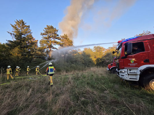 Beim Eintreffen der ersten Einheiten standen die Flammen bereits unmittelbar an der Grenze zu den Gärten mehrerer Wohnhäuser. Ein Löschangriff oberhalb der Brandstelle wurde umgehend eingeleitet, um die Bebauung zu schützen. Zeitgleich bekämpften geländegängige Tanklöschfahrzeuge den Brand direkt auf der Fläche.